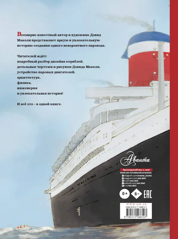 Дэвид Маколи — автор и иллюстратор, получивший международное признание и удостоенный множества наград. В книге "История одного корабля" он проводит читателя через увлекательную историю создания знаменитого океанского лайнера. Читатель узнает об изобретении и устройстве паровых двигателей, кораблей, углубится в историю кораблестроения и познакомится с известнейшими архитекторами. Великолепные детальные иллюстрации, добрый юмор, понятные описания простых и сложнейших конструкций и деталей кораблей делают эту книгу неповторимым подарком всем любителям техники, кораблей и просто хороших историй. Для среднего школьного возраста.