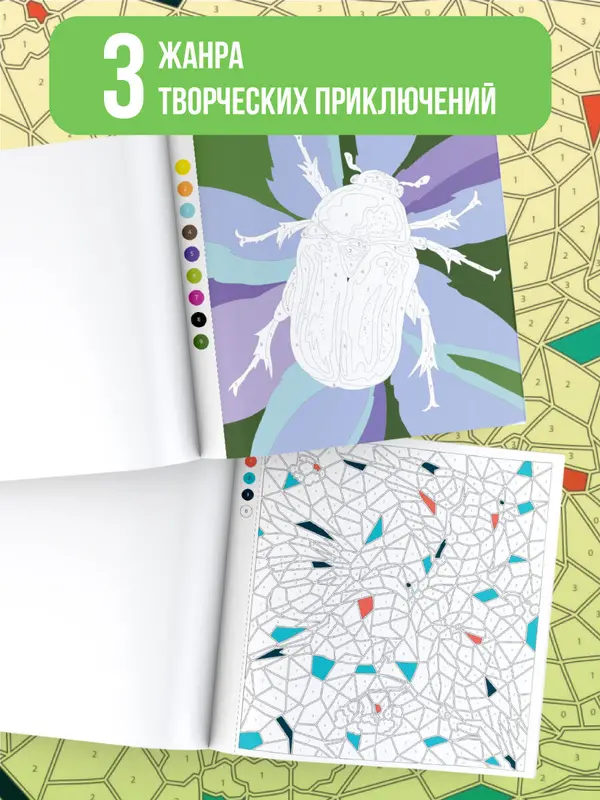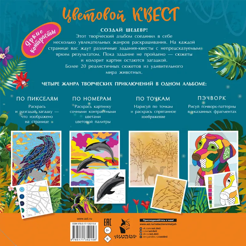 СОЗДАЙ ШЕДЕВР! Этот творческий альбом соединил в себе несколько увлекательных жанров раскрашивания. На каждой странице вас ждут различные задания-квесты с непредсказуемым ярким результатом. Пока задание не пройдено — сюжеты и колорит картин остаются загадкой. Более 20 реалистичных сюжетов из удивительного мира животных. ЧЕТЫРЕ ЖАНРА ТВОРЧЕСКИХ ПРИКЛЮЧЕНИЙ В ОДНОМ АЛЬБОМЕ: - Раскрась и разгадай загадку — что изображено на странице - Раскрась картинку сочными контрастными цветами цветовой палитры - Нарисуй по точкам и раскрась спрятанное изображение - Рисуй пэчворк-паттерны в указанных фрагментах