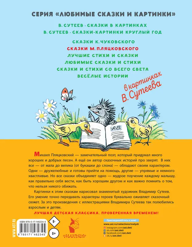 Серия "Любимые сказки и картинки" посвящена творчеству художника-сказочника, режиссёра-муль- типликатора, заслуженного деятеля искусств РСФСР Владимира Григорьевича Сутеева. На его сказках и картинках выросло несколько поколений читателей. Михаил Пляцковский — известный поэт, автор песен и сказок. В нашу книгу вошли его сказки: "Ромашки в январе", "Босолапки на кожаном ходу", "Разноцветные зверята", "Солнышко на память" и многие другие. А ещё в книгу вошла сказочная повесть для малышей "Дневник кузнечика Кузи". И хотя герои этих произведений — зверята и букашки, ведут они себя как люди: ссорятся и мирятся, учатся дружить и помогать друг другу в беде. Эти добрые сказки научат малыша быть смелым и от- зывчивым, а зверята на собственном примере покажут, что может случиться, если лениться или жад- ничать. Рисунки В. Сутеева. Для дошкольного возраста.