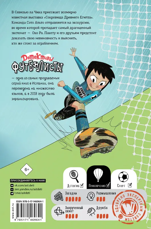 В Севилью ла Чика приезжает всемирно известная выставка "Сокровища Древнего Египта". Это определённо событие года, все вокруг только и говорят об этом. Команда детективов-футболистов отправляется на экскурсию, во время которой пропадает самый драгоценный экспонат - Око Ра. Пакету и его друзьям предстоит доказать свою невиновность и выяснить, кто же стоит за ограблением. Автор Роберто Сантьяго работал сценаристом на телевидении, редактором и продюсером. Серия про детективов-футболистов стала настоящим культурным феноменом, это одни из самых продаваемых книг в Испании, они переведены на разные языки мира, а в 2018 году даже были экранизированы.