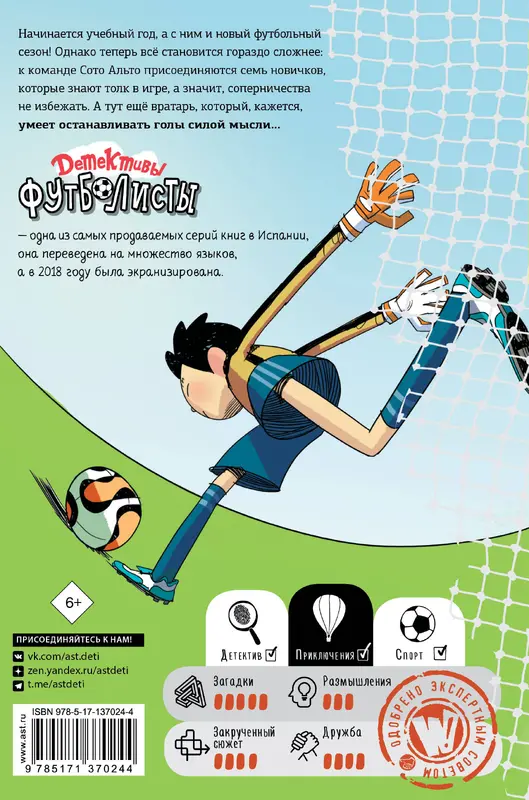 Начинается новый учебный год, а с ним и Лига футбола! Однако теперь всё становится гораздо сложнее: к команде Сото Альто присоединяется семь новичков, которые знают толк в игре, а значит, соперничества не избежать. Кроме того, место в Центральной лиге зависит от победы в двух играх. А тут ещё и первые симпатии, и тот парень-вратарь, который, кажется, умеет останавливать голы мысленно... Автор Роберто Сантьяго работал сценаристом на телевидении, редактором и продюсером. Серия про детективов-футболистов стала настоящим культурным феноменом, это одни из самых продаваемых книг в Испании, они переведены на разные языки мира, а в 2018 году даже были экранизированы.