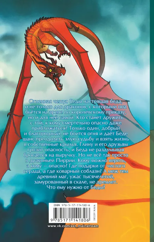 Огненная чешуя Беды — настоящая беда, и не только для драконов, с которыми она бьётся на арене по королевскому приказу, но и для неё самой. Кто станет дружить с той, к кому смертельно опасно даже приближаться? Только один, добрый и благородный, не боится огня и даёт Беде шанс преодолеть злую судьбу и взять жизнь в собственные крылья. Глину и его друзьям грозит опасность, и Беда не раздумывая бросается на выручку. Но не всё так просто в драконьей Пиррии. Кому можно верить, а кому — опасно? Где подарки от чистого сердца, а где коварный соблазн? А меж тем древний маг, ужас тысячелетий, замурованный в скале, не дремлет. Что ему нужно от Беды?