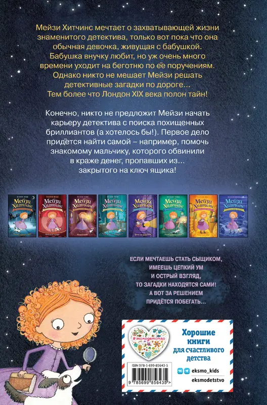 Конечно, никто не предложит Мейзи начать карьеру детектива с поиска похищенных бриллиантов (а хотелось бы!). Первое дело придётся найти самой – например, помочь знакомому мальчику, которого обвинили в краже денег, пропавших из… закрытого на ключ ящика!