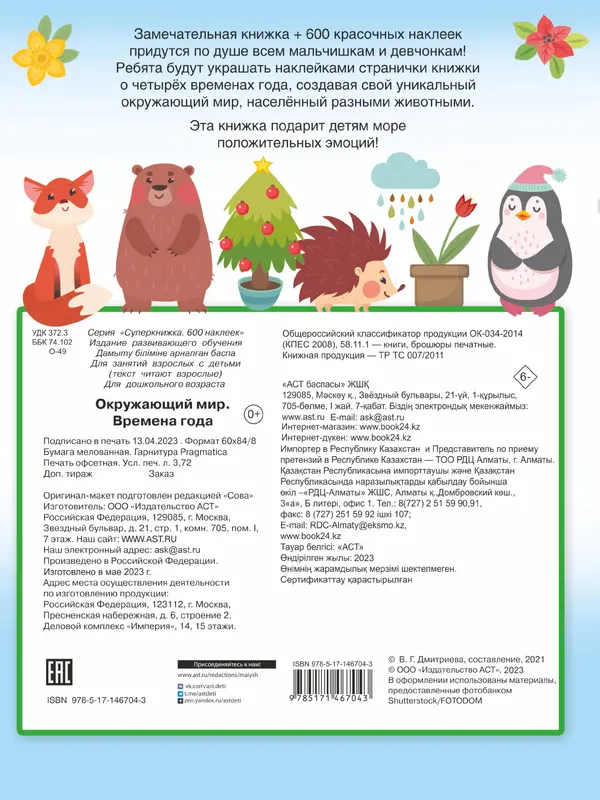 Книга "Окружающий мир и времена года + 600 наклеек"— это множество интересных заданий, которые позволят ребятам познакомиться с временами года. Малыш сможет, проявить творческие способности — наклеивая красочные стикеры на яркие картинки-фоны, дети будут создавать свои собственные уникальные рисунки времён года. Для дошкольного возраста