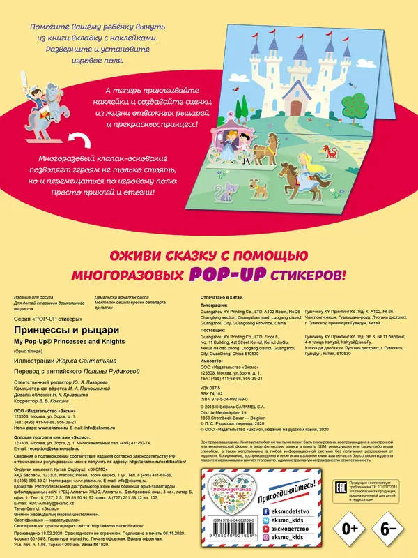 Помогите вашему ребёнку вынуть из книги вкладку с наклейками. Разверните и установите игровое поле. А теперь приклеивайте наклейки и создавайте сценки из жизни отважных рыцарей и прекрасных принцесс! Многоразовый клапан-основание позволяет героям не только стоять, но и перемещаться по игровому полю. Просто приклей и отогни! Оживи сказку с помощью многоразовых стикеров!