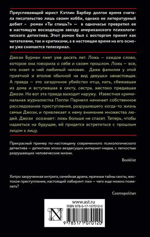 Джози Бурман лжет уже десять лет. Ложь – каждое слово, которое она говорила о себе и своем прошлом. Ложь – все, что знает о ней любимый человек. Даже фамилия у этой приятной и вполне обычной на вид девушки ненастоящая. А правда – это загадочное убийство отца, мать, сбежавшая из дома и вступившая в секту, сестра, жестоко предавшая Джози. Но вот эта правда выходит наружу. Известная криминальная журналистка Поппи Парнелл начинает собственное расследование преступления, разрушившего когда-то жизнь семьи Джози, и привлекает к нему внимание множества людей. Джози осознает: ложь больше не спасет. Теперь, чтобы надеяться на будущее, ей придется встретиться с прошлым лицом к лицу.