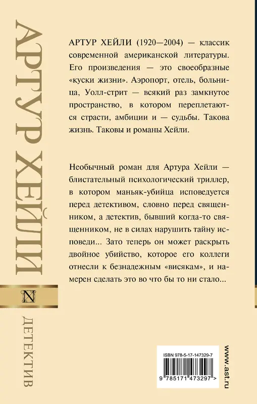 Необычный роман для Артура Хейли — блистательный психологический триллер, в котором маньяк-убийца исповедуется перед детективом, словно перед священником, а детектив, бывший когда-то священником, не в силах нарушить тайну исповеди... Зато теперь он может раскрыть двойное убийство, которое его коллеги отнесли к безнадежным "висякам", и намерен сделать это во что бы то ни стало...