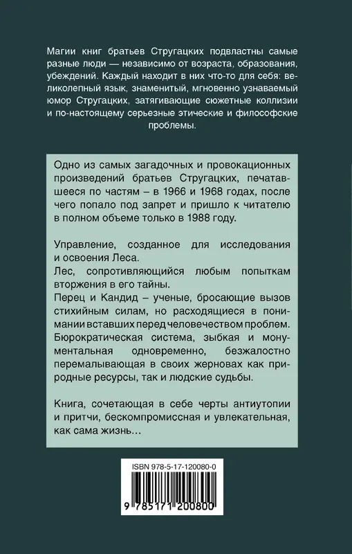 Одно из самых загадочных и провокационных произведений братьев Стругацких, печатавшееся по частям – в 1966 и 1968 годах, после чего попало под запрет и пришло к читателю в полном объеме только в 1988 году. Управление, созданное для исследования и освоения Леса. Лес, сопротивляющийся любым попыткам вторжения в его тайны. Перец и Кандид – ученые, бросающие вызов стихийным силам, но расходящиеся в понимании вставших перед человечеством проблем. Бюрократическая система, зыбкая и монументальная одновременно, безжалостно перемалывающая в своих жерновах как природные ресурсы, так и людские судьбы. Книга, сочетающая в себе черты антиутопии и притчи, бескомпромиссная и увлекательная, как сама жизнь…
