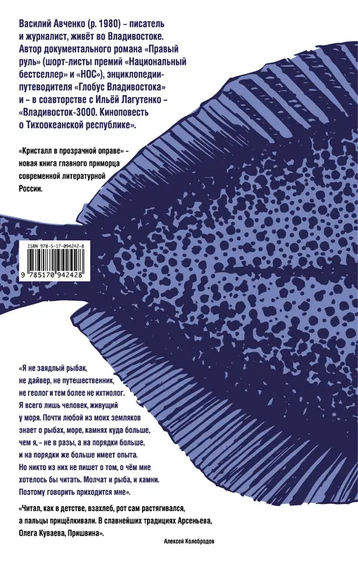 Василий Авченко – писатель и журналист, живет во Владивостоке. Автор документального романа "Правый руль" (шорт-листы премий "Национальный бестселлер" и "НОС"), энциклопедии-путеводителя "Глобус Владивостока" и – в соавторстве с Ильёй Лагутенко – "Владивосток-3000. Киноповесть о Тихоокеанской республике". Новая книга "Кристалл в прозрачной оправе" – уникальное, почти художественное и в то же время полное удивительных фактов описание жизни на Дальнем Востоке. "Я всего лишь человек, живущий у моря, – говорит автор. – Почти любой из моих земляков знает о рыбах, море, камнях куда больше, чем я. Но никто из них не пишет о том, о чём мне хотелось бы читать. Молчат и рыба, и камни. Поэтому говорить приходится мне". Книга вошла в шорт-лист премии "Национальный бестселлер".