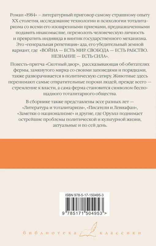 Роман "1984" – литературный приговор самому страшному опыту ХХ столетия, исследование технологии и психологии тоталитаризма со всеми его изощренными приемами, предназначенными подавить инакомыслие, перемолоть человеческую личность и превратить индивида в винтик государственного механизма. Это "генеральная репетиция" ада, его убедительный земной вариант, где "ВОЙНА ЕСТЬ МИР. СВОБОДА ЕСТЬ РАБСТВО. НЕЗНАНИЕ ЕСТЬ СИЛА". Повесть-притча "Скотный двор", рассказывающая об обитателях фермы, замкнутого мирка со своими заповедями и порядками, также разворачивается в политическую сатиру. Животные здесь перенимают самые отвратительные пороки людей, прежде всего – стремление к власти, а сама ферма становится символом беспощадного тоталитарного общества. В сборнике также представлены эссе разных лет – "Литература и тоталитаризм", "Писатели и Левиафан", "Заметки о национализме" и другие, где Оруэлл поднимает острейшие проблемы политической и культурной жизни, актуальные и по сей день.