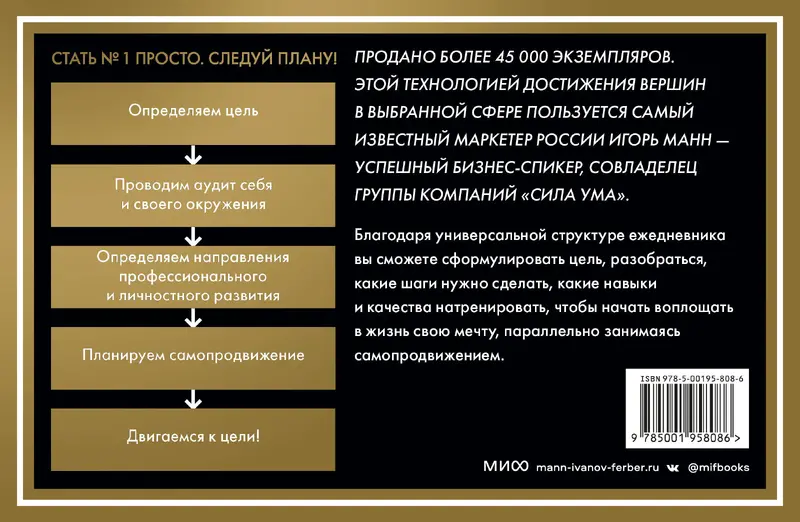 Практичный инструмент от Игоря Манна, который поможет вам пройти путь до "Номера 1". Этот еженедельник — дополнение к бестселлеру "Номер 1" Игоря Манна и практикум по ней. С ним вы сможете пройти все шаги, необходимые для того, чтобы стать Номером 1: постановка цели — амбициозной, реалистичной, соответствующей вашим интересам; аудит: всесторонне оцените свои исходные данные и возможности: физические данные, личностные качества, профессиональные навыки; планирование и развитие — профессиональное и личное; самопродвижение: ведите системную работу над своим персональным брендом. В ежедневнике есть недатированный календарный раздел, который позволит распределить всю работу над собой на год; мотивирующие цитаты, рекомендации и советы от Игоря Манна, многочисленные упражнения и чек-листы для работы над собой. Кстати, этот еженедельник одинаково удобен и для правшей, и для левшей. Для кого эта книга: Для тех, кто хочет стать лучшим в том, что делает. Для тех, кто прочитал книгу "Номер 1" и хочет начать работать над собой.