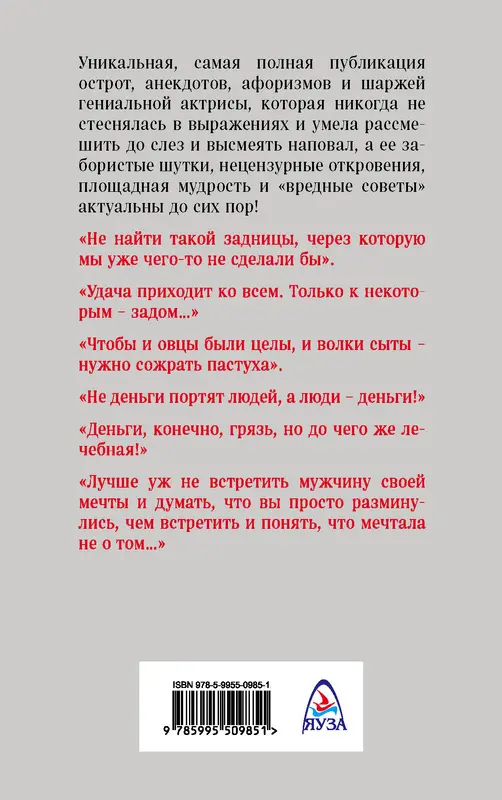 Уникальная, самая полная публикация острот, анекдотов, афоризмов и шаржей гениальной актрисы, которая никогда не стеснялась в выражениях и умела рассмешить до слез и высмеять наповал, а ее забористые шутки, нецензурные откровения, площадная мудрость и "вредные советы" актуальны до сих пор! "Не найти такой задницы, через которую мы уже чего-то ни сделали бы" "Удача приходит ко всем. Только к некоторым – задом…" "Чтобы и овцы были целы, и волки сыты – нужно сожрать пастуха" "Не деньги портят людей, а люди – деньги!" "Деньги, конечно, грязь, но до чего же лечебная!" "Лучше уж не встретить мужчину своей мечты и думать, что вы просто разминулись, чем встретить и понять, что мечтала не о том…" "Красота – страшная сила, и с каждым годом всё страшнее и страшнее…"