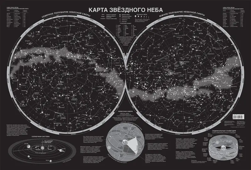 На этой необычной настенной карте с обрезными размерами 1170х790 мм представлены северное и южноео полушария небесной сферы. Так ночное небо с мерцающими на нём галактиками, туманностями и звёздными скоплениями выглядит с Северного и Южного полюсов Земли. Наиболее яркие звёзды, формирующие созвездия, покрыты флуоресцентной краской и, заряжаясь при солнечном или электрическом свете, в темноте мерцают, создавая полную иллюзию звёздного неба. Звёзды на карте ранжированы по видимой звёздной величине. Даны названия самых ярких звёзд и условные очертания всех 88 созвездий. Приведёны краткие сведения о Солнечной системе, небесной сфере, звёздных координатах, эклиптике и зодиакальном круге. Карта может быть рекомендована всем, кто интересуется астрономией и любит романтику. Карта звёздного неба упакована в прозрачный тубус (пакет с объёмным дном и еврослотом) из мягкого пластика. Размеры тубуса: длина 800 мм, диаметр 50 мм.