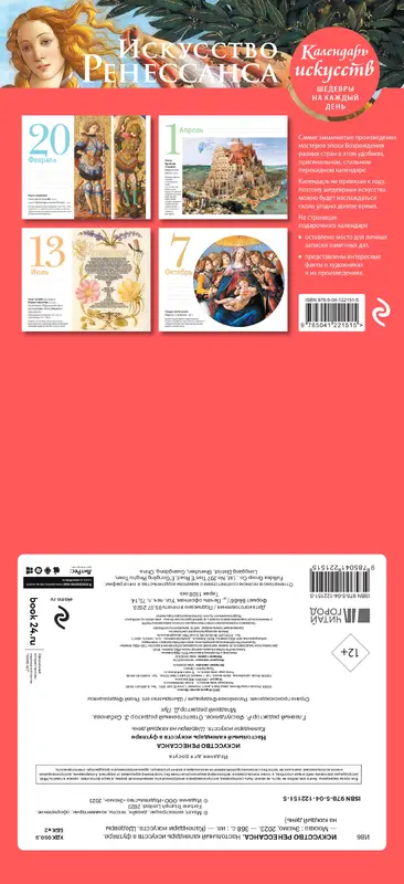 Этот иллюстрированный календарь представляет бессмертные шедевры Ренессанса. Боттичелли, Леонардо, Рафаэль, Микеланджело и многие, многие гении живописи жили и творили в эту эпоху, когда властвовали красота и человек как высшая ценность. Их великие произведения — перед Вами. Судьбы художников, их картины и, конечно же, вдохновение на каждый день,— все это удивительный мир под названием "Искусство Ренессанса".