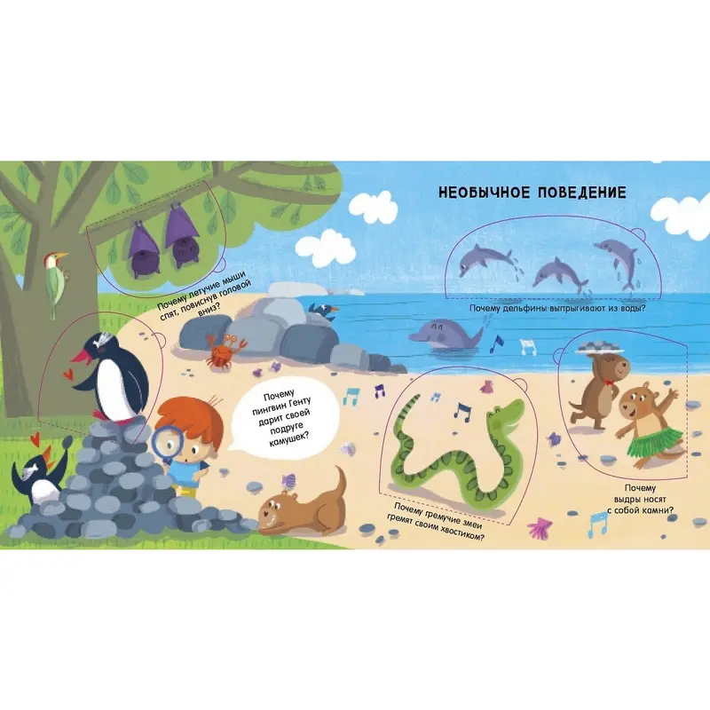 Почему комары кусают? Почему у птиц есть перья? Почему дельфины выпрыгивают из воды? Почему слоны не могут прыгать? В этой книге вы найдёте ответы на самые популярные детские вопросы о животных, их повадках и особенностях. Книга сделана из толстого, качественного картона. В книге более 30 секретных окошек. Стильные и яркие картинки на каждой странице. Книга способствует развитию внимания, речи, логического мышления, памяти, воображения и мелкой моторики.