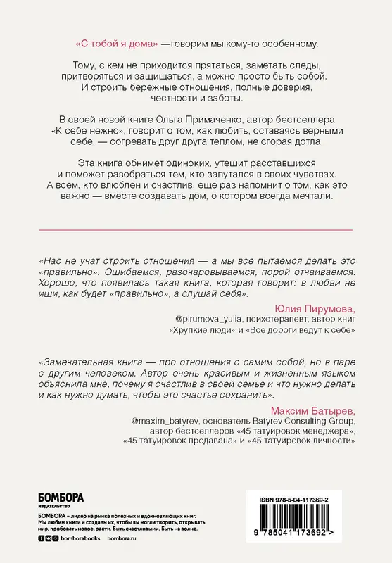 "С тобой я дома", — говорим мы кому-то особенному. Тому, с кем не приходится прятаться, заметать следы, притворяться и защищаться, — а можно просто быть собой. И строить бережные отношения, полные доверия, честности и заботы. В своей новой книге Ольга Примаченко, автор бестселлера "К себе нежно", говорит о том, как любить, оставаясь верными себе, — согревать друг друга теплом, не сгорая дотла. Эта книга обнимет одиноких, утешит расставшихся и поможет разобраться тем, кто запутался в своих чувствах. А всем, кто влюблен и счастлив, еще раз напомнит о том, как это важно — вместе создавать дом, о котором всегда мечтали.