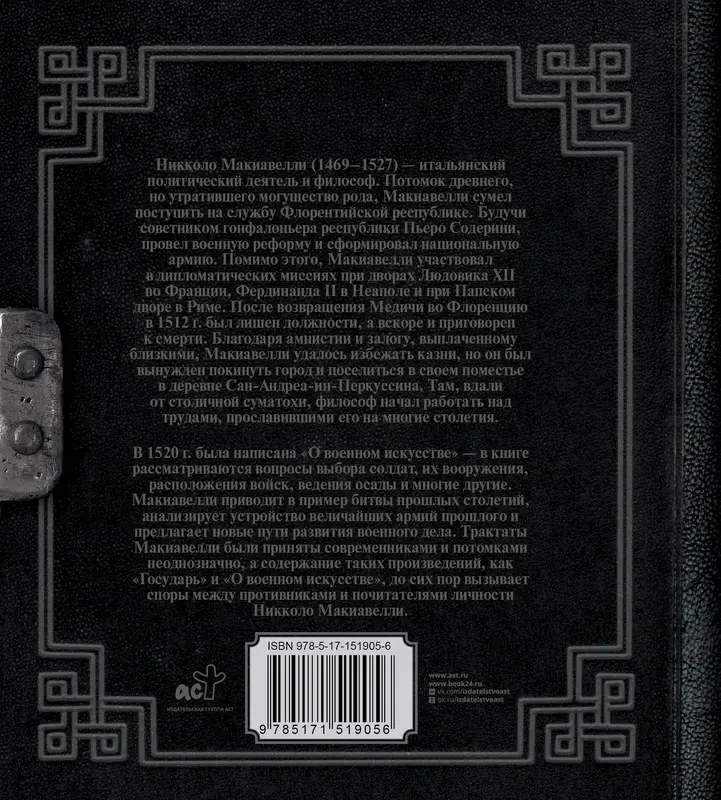 Никколо Макиавелли (1469–1527) - итальянский политический деятель и философ. Будучи советником гонфалоньера республики Пьеро Содерини, провел военную реформу и сформировал национальную армию. Помимо этого, Макиавелли участвовал в дипломатических миссиях при дворах Людовика XII во Франции, Фердинанда II в Неаполе и при Папском дворе в Риме. После возвращения Медичи во Флоренцию в 1512 г. был лишен должности и лишь благодаря амнистии и залогу, выплаченному близкими, избежал казни. Политик был вынужден покинуть город и поселиться в поместье в деревне Сан-Андреа-ин-Перкуссина. Там он начал работать над трудами, прославившими его на многие столетия. В 1520 г. была написана "О военном искусстве" - в книге рассматриваются вопросы выбора солдат, их вооружения, расположения войск, ведения осады и многие другие. Макиавелли приводит в пример битвы прошлых столетий, анализирует устройство величайших армий прошлого и предлагает новые пути развития военного дела. Трактаты Макиавелли были приняты современниками и потомками неоднозначно, а содержание таких произведений, как "Государь" и "О военном искусстве", до сих пор вызывает споры между противниками и почитателями личности Никколо Макиавелли.