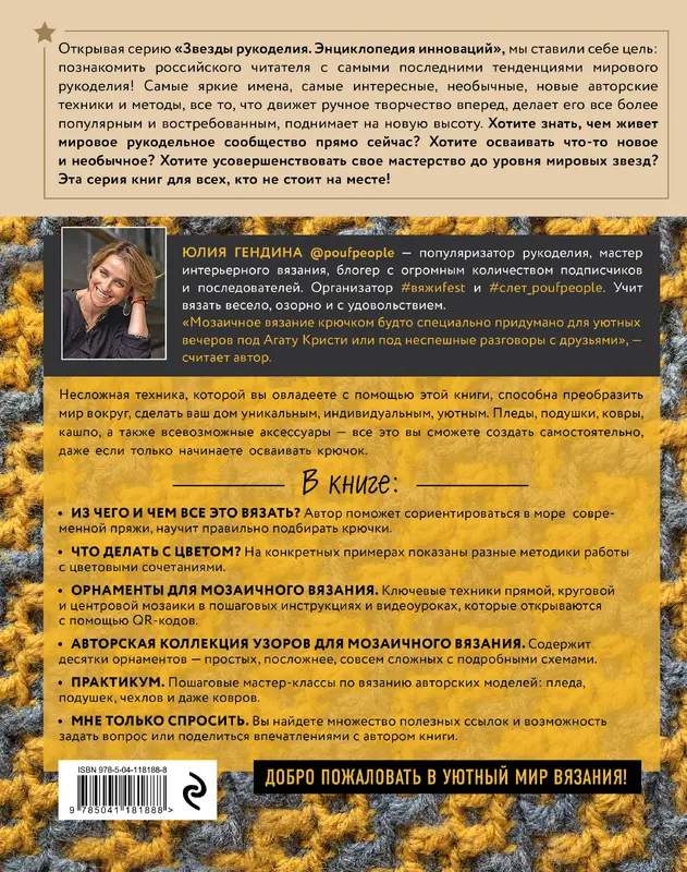 "Мозаичное вязание крючком будто специально придумано для уютных вечеров под Агату Кристи или под неспешные разговоры с друзьями" - считает автор этой необыкновенной книги Юлия Гендина - популярный блогер, мастер интерьерного вязания, организатор самых разных онлайн-фестивалей, слетов и других мероприятий, объединяющих увлеченных вязальщиц. Вязать нужно весело, легко, так, чтобы получать удовольствие и от процесса, и от результата. Именно поэтому она посвятила свою книгу своему любимому виду вязания крючком - мозаичному. Несложная техника, которая полно, подробно и красочно представлена в этой книге, сделает ваш дом современным, стильным, уютным, и что особенно важно, индивидуальным! Вы сможете создать великолепные пледы, подушки, коврики, любые аксессуары, даже если только начинаете осваивать крючок. С помощью автора вы узнаете из чего и чем лучше вязать, как подбирать цвета для мозаичного вязания, сможете выбрать узоры любой степени сложности из обширной авторской коллекции мотивов с четкими и внятными схемами, отточите свои навыки, создавая авторские модели по подробным пошаговым мастер-классам, а еще, и это уникальная особенность книги, сможете найти единомышленников и круг общения таких же энтузиастов вязания, задать вопрос автору или более продвинутым мастерам, проконсультироваться или просто похвалиться собственноручно созданным пледом! Мозаичное вязание способно изменить жизнь - так считает автор и заражает своим энтузиазмом своих учеников, последователей, а теперь и читателей!!