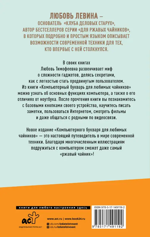 Любовь Левина — основатель "Клуба деловых старух", автор бестселлеров серии "Для ржавых чайников", в которых подробно и простым языком описывает возможности современной техники для тех, кто впервые с ней столкнулся. В своих книгах Любовь Тимофеевна развенчивает миф о сложности гаджетов, делясь секретами, как с лёгкостью стать продвинутым пользователем. В книге "Компьютерный букварь для любимых чайников" можно узнать об основных функциях компьютера, а также о его отличиях от ноутбука. После прочтения книги вы познакомитесь с базовыми кнопками своего устройства, научитесь писать заметки, пользоваться Интернетом, смотреть фильмы и даже общаться с родными по видеосвязи. Новое издание "Компьютерного букваря для любимых чайников" — это настоящий путеводитель в мире современной техники. Благодаря многочисленным иллюстрациям подружиться с компьютером сможет даже самый "ржавый чайник"!