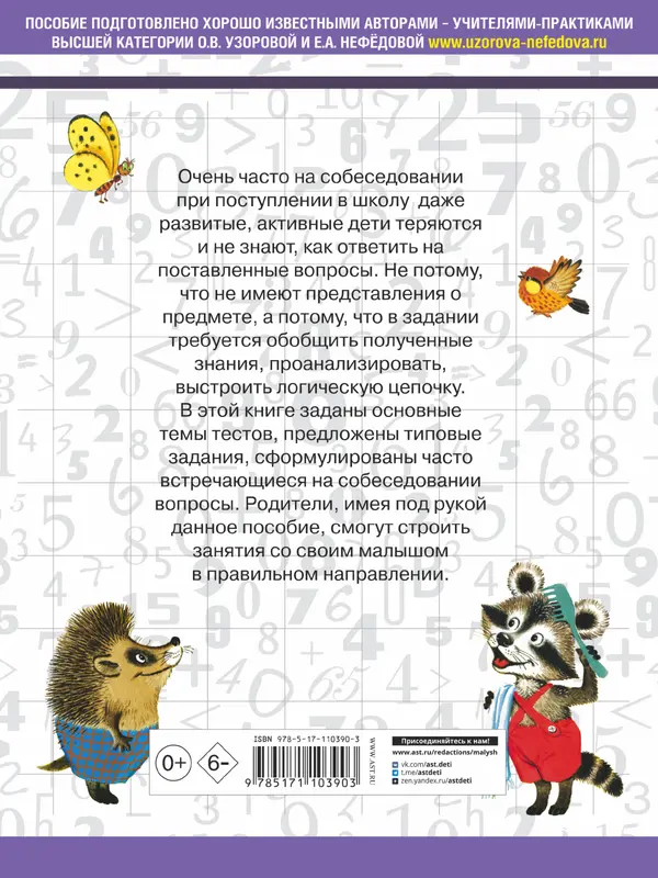 Очень часто на собеседовании при поступлении в школу даже развитые, активные дети теряются и не знают, как ответить на поставленные вопросы. Не потому, что не имеют представления о предмете, а потому что, в задании требуется обобщить полученные знания, проанализировать, выстроить логическую цепочку. В этой книге заданы основные темы тестов, предложены типовые задания, сформулированы наиболее часто встречающиеся на собеседовании вопросы. Родители, имея под рукой данное пособие, смогут строить занятия со своим малышом в правильном направлении.