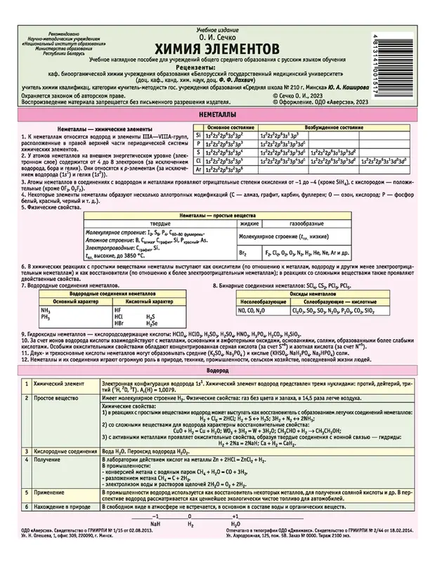 Буклет составлен на основе учебной программы для учреждений общего среднего образования. В нем содержится тщательно отобранный и детально систематизированный материал, являющийся основой для успешного изучения школьного курса химии; представлен в виде оригинальных подробных схем и таблиц с текстовыми и графическими пояснениями и многочисленными примерами уравнений реакций.