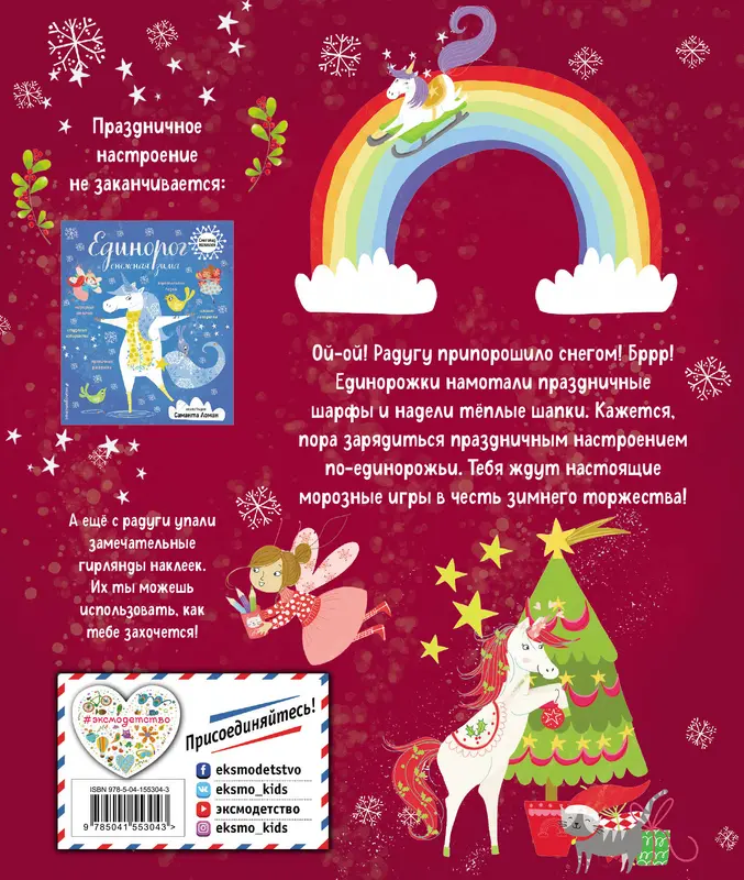 Ты любишь снег и тёплые варежки так же, как любят их на радуге? Давай-ка проверим. Радугу припорошило снегом, и единорожки просто в восторге от зимы. Они резвятся и веселятся на каждой страничке этой по-настоящему снежной книги. Проходи вместе с ними лабиринты, разгадывай сетки со словами, собирай пазлы, ищи отличия, подбирай тени, рисуй, раскрашивай и делай много чего ещё! Радуга уже опустила к тебе свой хвостик - забирайся и играй! А еще искупайся в снегопаде наклеек. Их ты сможешь наклеить куда захочется! Наполни дом зимним волшебством вместе с единорожками и другими жителями зарадужья!