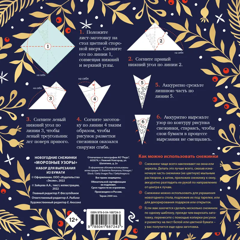 Бумажные снежинки – традиционное и любимое уже многими поколениями новогоднее украшение. Этот комплект поможет вам создать потрясающе красивые ажурные снежинки! Внутри вы найдете восемь цветных листов-заготовок с нанесенной разметкой контура для вырезания. Вам нужно всего лишь сложить лист-заготовку по приведенной на упаковке схеме и затем вырезать ножницами снежинку по линиям.