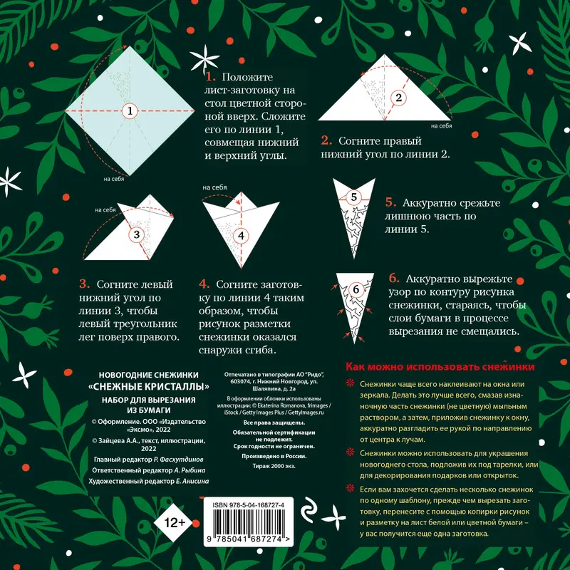 Бумажные снежинки – традиционное и любимое уже многими поколениями новогоднее украшение. Этот комплект поможет вам создать потрясающе красивые ажурные снежинки! Внутри вы найдете восемь цветных листов-заготовок с нанесенной разметкой контура для вырезания. Вам нужно всего лишь сложить лист-заготовку по приведенной на упаковке схеме и затем вырезать ножницами снежинку по линиям.