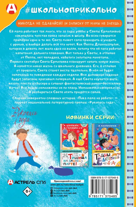 Её мама работает так много, что за годы учёбы у Светы Ермолаевой накопилась толстая пачка записок в школу. Во всех говорится примерно одно и то же: Света может сама приходить и уходить с уроков и вообще делать всё, что хочет. Как Пеппи Длинныйчулок, которая в девять лет жила одна на вилле, потому что её папа работал капитаном дальнего плавания. Вот только у Светы, в отличие от Пеппи, нет чемодана, набитого золотыми монетами. Первого сентября Света Ермолаева планирует начать новую жизнь. А начнётся новая жизнь со школьного дневника. Его, в отличие от прошлого, Света станет вести тщательно. В нём не будет замечаний по поведению каждую неделю. Все домашние задания будут записаны красивым почерком. А ещё Света научится шить, вязать, плести из бисера и сочинит фантастический романбестселлер. Ха-ха! Всё пошло немножечко не по плану. Немножечко наперекосяк. А разбираться Свете опять придётся самой. Решать, смотреть ли фильм "16+". На какой урок сходить, а какой прогулять. Подраться или не стоит. Но Света справляется. Она сильная — недаром в школе её зовут Бегемотиной. И правда, нужно сил, как у бегемота, чтобы победить здоровенного одноклассника и поднять тяжеленный груз на физкультуре — а Света может и то и другое. Но ещё силы нужны, чтобы заступиться за слабого и помочь тому, кто нуждается в помощи. Даже если после этого появится очередное замечание в дневнике! Сборник невероятно смешных историй "Пока мама на работе" — лауреат национальной литературной премии "Рукопись года".