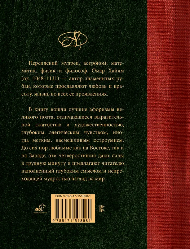 Персидский мудрец, астроном, математик, физик и философ, Омар Хайям (ок. 1048–1131) — автор знаменитых рубаи, которые прославляют любовь и красоту, жизнь во всех ее проявлениях. В книгу вошли лучшие афоризмы великого поэта в классических переводах, отличающиеся выразительной сжатостью и художественностью, глубоким элегическим чувством, иногда метким, насмешливым остроумием. До сих пор любимые как на Востоке, так и на Западе, эти четверостишия дают силы в трудную минуту и предлагают читателю наполненный глубоким смыслом и непреходящей мудростью взгляд на мир.