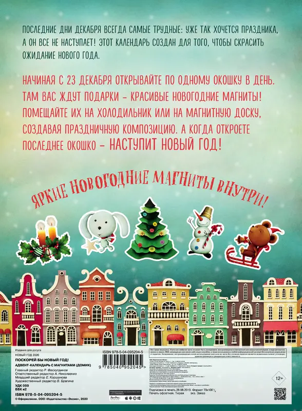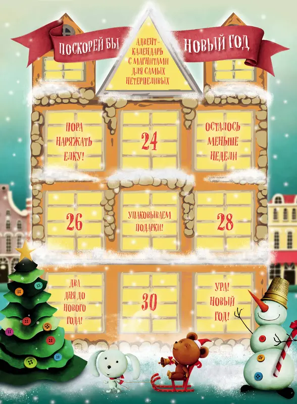 Классический адвент-календарь с окошками-сюрпризами. Под окошками спрятаны милые новогодние магниты. Начиная с 23 декабря нужно открывать по одному окошку, чтобы прочувствовать приближение праздника и новогоднее настроение.