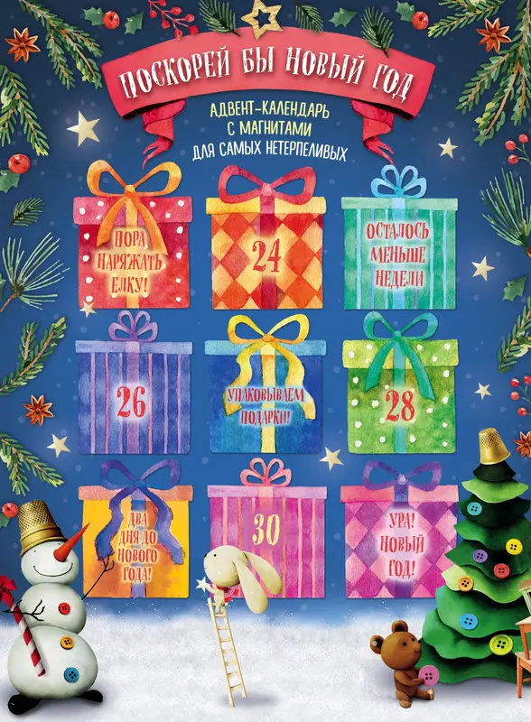 Классический адвент-календарь с окошками-сюрпризами. Под окошками спрятаны милые новогодние магниты. Начиная с 23 декабря нужно открывать по одному окошку, чтобы прочувствовать приближение праздника и новогоднее настроение.