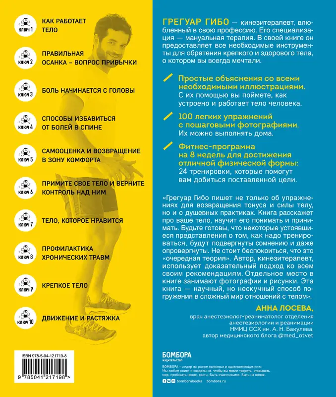 Кто-то хочет похудеть при помощи спорта, но, не увидев желаемый результат через месяц, сдается и бросает занятия. Кто-то боится, что физические нагрузки плохо скажутся на суставах и спровоцируют их болезни. А некоторые не могут найти в себе силы хотя бы на 15-минутную прогулку или легкую гимнастику, потому что эмоциональное состояние оставляет желать лучшего. Грегуар Гибо, практикующий кинезитерапевт, и его пациенты обращаются к нему с подобными проблемами. В своей книге он объяснят, как, сколько и почему нужно двигаться. Разбирает ошибки, которые обнуляют эффект от выполненных упражнений, рассказывает, как справиться с болью в спине, что такое идеальная осанка и почему лучший вид спорта – этот тот, что вам больше всего нравится. В книге есть теория и практика, истории пациентов, иллюстрации и фотографии, которые помогут вам закрепить полученные знания и с успехом применять их в своей повседневной жизни.