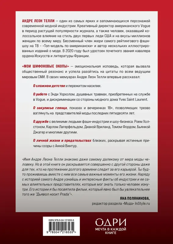 Мемуары Андре Леона Тэлли – не просто рассказ о его сложном пути, а откровенная исповедь человека, чья карьера внезапно разбилась о жестокие стандарты индустрии. В своей книге Андре впервые поделился воспоминаниями о тяжелом детстве и насилии в возрасте 8 лет, о переезде в Париж и сотрудничестве с Энди Уорхолом, о дискриминации со стороны модного Дома Yves Saint Laurent и службе в Vogue, где он заработал себе имя, репутацию и душевные травмы, о которых не стеснялся говорить. Андре приоткрыл завесу глянцевой индустрии, в полной мере передав дух эпох клуба Studio 54, показов Джанни Версачи и Джона Гальяно, взлета карьеры Наоми Кэмпбелл и других культовых явлений тех времен. Представил десятки архивных фото и эксклюзивных историй, позволяющих трезво взглянуть на представителей моды последних пятидесяти лет: от Дианы Вриланд и Бьянки Джагер до Марка Джейкобса и Тома Форда. А также узнать, почему прервалась 40-летняя дружба с Карлом Лагерфельдом, и что стало истинной причиной ссоры Андре с Анной Винтур.
