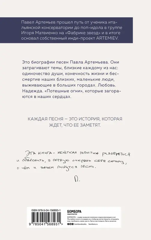 "Иногда кажется, что песня — это аномалия. Как что-то, настолько необязательное, вообще может существовать и вызывать привыкание, непонятно. А с другой стороны, как представить свою жизнь без песни? И найдется ли тот, кто не поет?" Павел Артемьев прошел путь от ученика итальянской консерватории до поп-идола в группе Игоря Матвиенко на "Фабрике звезд" и в итоге основал собственный инди-проект ARTEMIEV, чей репертуар совсем не похож на его карьеру в бойз-бенде. Это песни о семье, о смерти, о людях и домах вокруг нас, о Боге, об одиночестве, надежде и, конечно, о любви. Они написаны на английском и на русском языках. Текст каждой песни всегда становится полным только в соавторстве, в интерпретации слушателей. Но всё же, если вам интересно, при каких обстоятельства сочинялись эти стихи и что было на сердце у автора, что он хотел рассказать миру, то эта книга поможет вам найти ответы. Каждая песня — это история, которая ждет, что ее заметят.