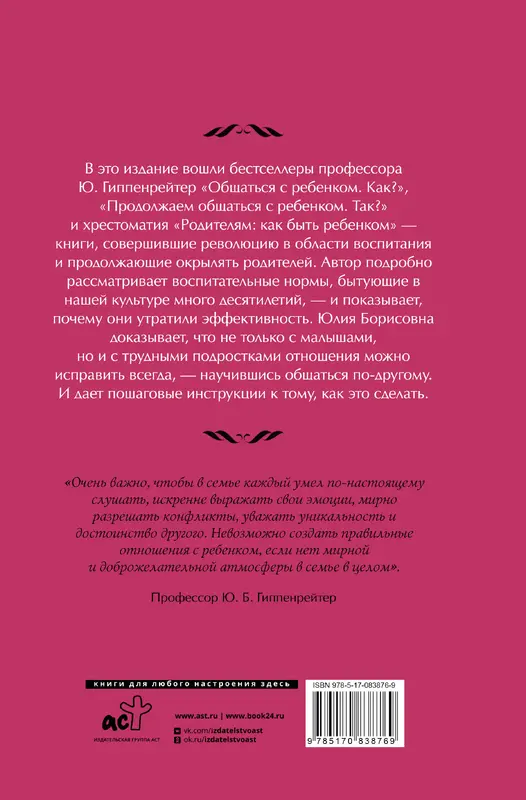 В это издание вошли бестселлеры профессора Ю. Б. Гиппенрейтер "Общаться с ребенком. Как?", "Продолжаем общаться с ребенком. Так?" и хрестоматия "Родителям: как быть ребенком" — книги, совершившие революцию в области воспитания и продолжающие окрылять родителей. Автор подробно рассматривает воспитательные нормы, бытующие в нашей культуре много десятилетий, — и показывает, почему они утратили эффективность. Юлия Борисовна доказывает, что не только с малышами, но и с трудными подростками отношения можно исправить всегда, — научившись общаться по-другому. И дает пошаговые инструкции к тому, как это сделать.