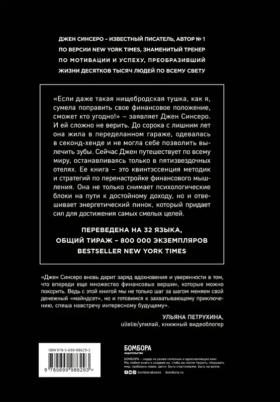 "Если даже такая нищебродская тушка, как я сумела поправить свое финансовое положение, сможет кто угодно!" - заявляет Джен Синсеро. И ей сложно не верить. До сорока с лишнем лет она жила в переделанном гараже, одевалась в секонд-хэнде и не могла себе позволить вылечить зубы. Сейчас Джен путешествует по всему миру, останавливаясь только в пятизвездочных отелях. Ее книга – это квинтэссенция методик и стратегий по перенастройке финансового мышления. Она не только снимает психологические блоки на пути к достойному доходу, но и отвешивает энергетический пинок, который придает сил для достижения самых смелых целей.