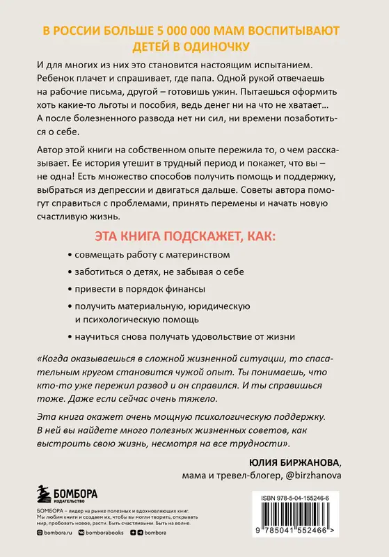 Для многих мам воспитание детей в одиночку становится настоящим испытанием. К финансовым и бытовым сложностям часто добавляются душевная боль после развода, предвзятое отношение окружающих, непонимание, как объяснить ситуацию ребенку. Автор этой книги на собственном опыте пережила то, о чем рассказывает. Ее история утешит в трудный период и покажет, что вы – не одна! Есть множество способов получить помощь и поддержку, выбраться из депрессии и двигаться дальше. Советы автора помогут справиться с проблемами, принять перемены и начать новую счастливую жизнь.
