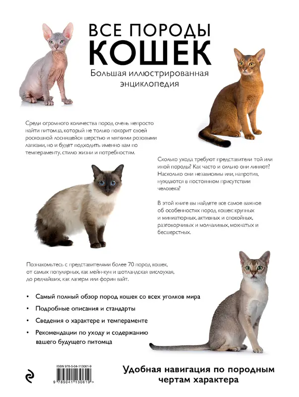 Каждая порода отличается своими особенностями в поведении, уходе и воспитании. Эта книга поможет выбрать именно ту кошку, которая не только зацепит своей неповторимой красотой и изящностью, но будет близка вам по характеру, образу жизни и предпочтениям. В ней рассказано обо всех популярных породах: крупных и миниатюрных, активных и спокойных, пушистых и короткошерстных. В обзоре каждой породы вы найдете подробное описание и стандарты, сведения о темпераменте будущего питомца, рекомендации по уходу и содержанию.