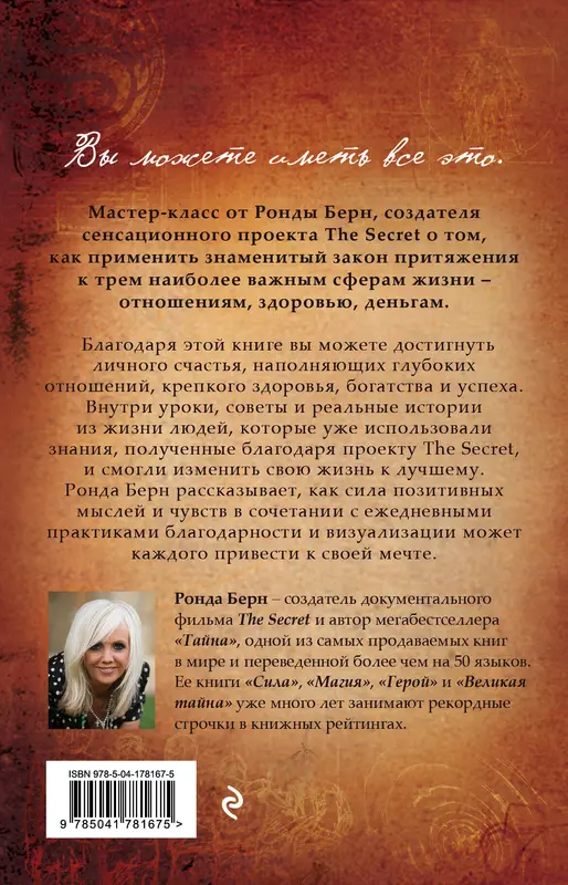 В своей новой книге Ронда Берн, автор документального фильма "The Secret" и мегабестселлера "Тайна", поделится с вами тайным знанием о том, как работает закон притяжения, и научит применять его к трем ключевым сферам нашей жизни: отношениям, здоровью и деньгам. Книга "Тайна любви, здоровья и денег" создана в форме мастер-класса и представляет собой бесценную коллекцию уроков, советов, тематических исследований и примеров из практики автора "Хотите изменить свою жизнь? Измените свое отношение к ней", - говорит Ронда Берн и увлекает читателя вслед за собой, мягко и бережно настраивая его на вибрацию удачи и позитивных перемен.