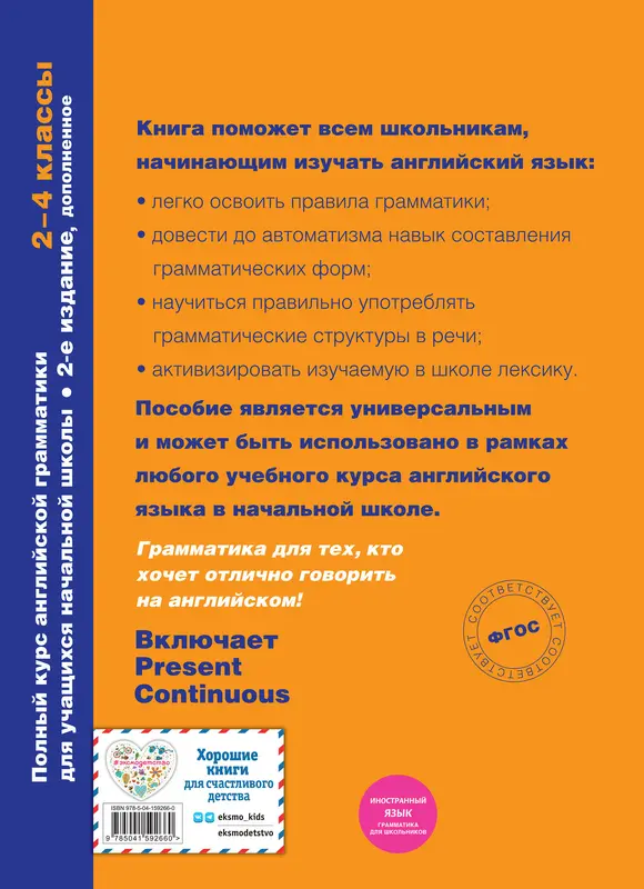 В этой книге содержатся все темы английской грамматики, которые проходят во 2-4 классах общеобразовательной школы. По какому бы учебнику ни велись занятия в школе, эта книга поможет найти ответы на все вопросы ребенка об английской грамматике и научиться правильно и уверенно применять правила и грамматические конструкции. Соответствие школьной программе, простота, наглядность и доступность изложения материала, большое количество и разнообразие упражнений для практики, наличие заданий разной степени сложности, соответствие возрастным особенностям и возможностям учащихся делают это пособие незаменимым для изучения английского языка в начальной школе. Пособие предназначено для младших школьников, изучающих английский язык в школе или дома, с родителями или преподавателем. Оно станет эффективным дополнением любого учебного курса.