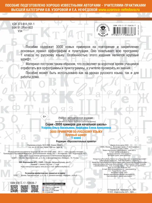 Пособие содержит 3000 новых примеров на повторение и закрепление основных правил орфографии и пунктуации, Оно охватывает всю программу 1 класса по русскому языку. Особенностью этого издания является крупный шрифт. Материал построен таким образом, что позволяет за короткое время учащимся отработать все орфограммы и пунктограммы, а учителю проверить их знания. Пособие может быть использовано как на уроках русского языка, так и для работы дома.