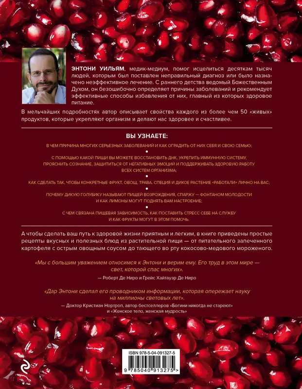 В своей книге всемирно известный целитель, медик-медиум, Энтони Уильям рассказывает о целебной силе, скрытой во фруктах, овощах, травах, специях и диких растениях. Вы узнаете, что дары природы не только способны оказать нам эмоциональную поддержку и дать ценный духовный урок, но и помочь ослабленному болезнью организму справиться с ней. В мельчайших подробностях автор описывает свойства каждого из более чем пятидесяти "живых" продуктов, которые укрепляют организм при некоторых заболеваниях.. А чтобы сделать ваш путь к крепкому здоровью приятным и легким в книге приведены простые рецепты вкусных и полезных блюд из растительной пищи — от питательного запеченного картофеля с острым овощным соусом до тающего во рту кокосово-медового мороженого.